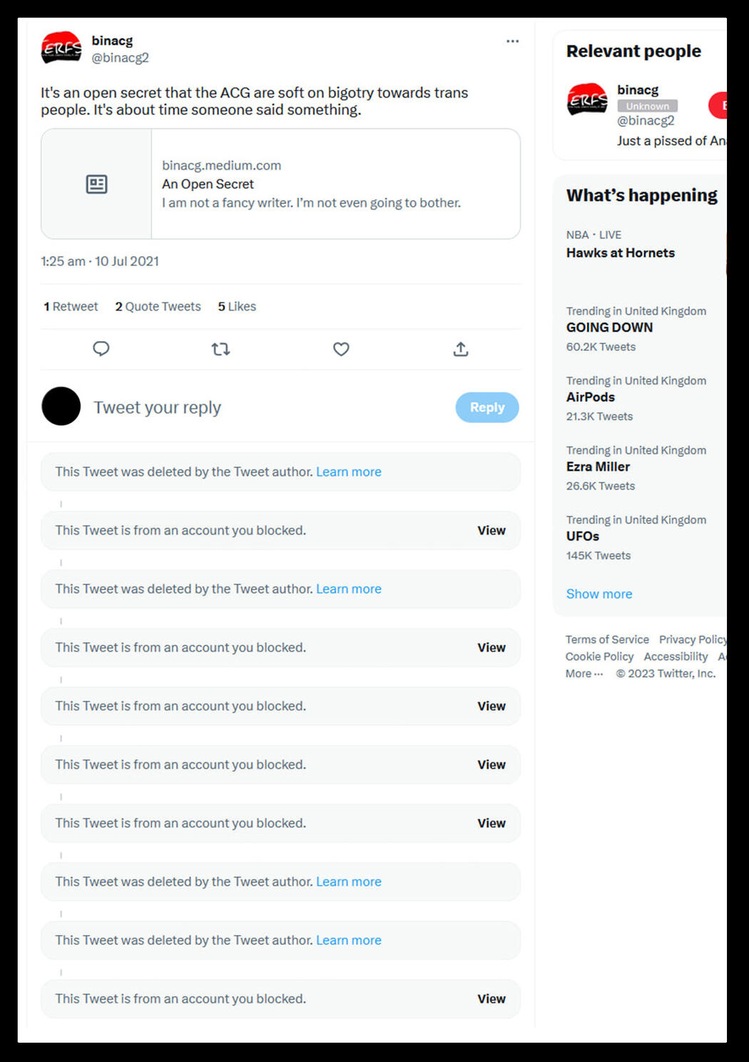 Unfortunatly, shortly after, (someone definately not a member of ACG I'm sure), posted all the same information under a sock puppet account.This forced me to consider myself doxxed entirely. I've been through this before at the hands of fascists and take the compromised situation seriously.I moved house shortly after, I had to have my registered work addresses go through proxies (at some expense), had to delete my family and friends from my personal social accounts, remove my picture and those of locations around me, and generally deal with a whole lot of stress. This was particularly enhanced by ongoing life life matters which members of ACG are aware off.They made the choice to do me harm becuase of political disagreements.2021 as they did in 2022 and do in 2023.