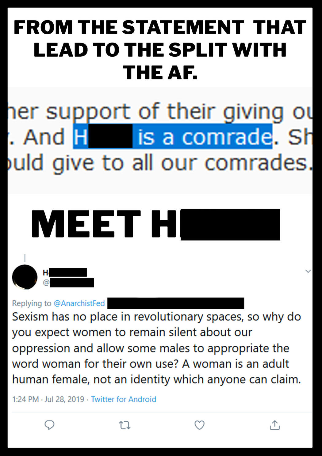 - Expressed solidarity with the Transphobe who became the focal point of events.Many members of the AF (trans and cis alike) had a major issue with this. They rejected all the concerns and shortly after announced they would leave the federation.It's important to note here that leaving the AF to start a new organisation more specific to your politics is all part of a good and healthy movement. I do not judge them for this move. They have a reductive understanding of identity politics and felt that we were all liberals now. Fine. Ciao.The AF, now free of the weight, became overtly intersectional and pro-active in our support for trans comrades. This is called solidarity.