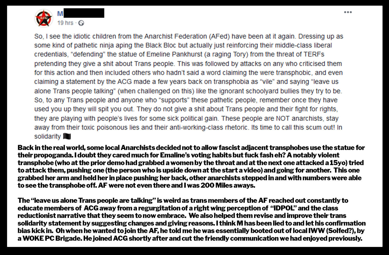 By May 2022, ACG organisers had pretty much entirely lost the plot. Tamping over the bookfairs and some imagined feud. Sniping would become semi-regular. The AF maintained radio silence and we did our best to ignore them and just crack on with doing actual anarchist things.They decided instead to label myself and the editor of Freedom as enemies.Then the transphobes came to Manchester. Posie Parker (A Fascist adjacant bigot) was on a tour and in Manchester there was a mild hoo-haw between her support and the counter protest.There was an AF flag there so immediately some in the crowd decided we were responsible. A popular writer for Spiked/GBNews (Who is quite the Gender Critical comrade who also believes all the "middle class liberals" are ruining working class anarchism) decided to falsely identify us as the culprits and paint a picture of "Anarchists Attack women". Knowning I'm from Manchester, ACG mouthpiece M, decided to post about this, identifying myself and going on a rant about the evils of the AF. Those who corrected this false narrative were shut down and even removed from the Facebook group this tosh was being posted.They did this to a group 12.5k strong.ACG Members told 12,500 Anarchists that I attack woman and refused to be corrected or apologise.