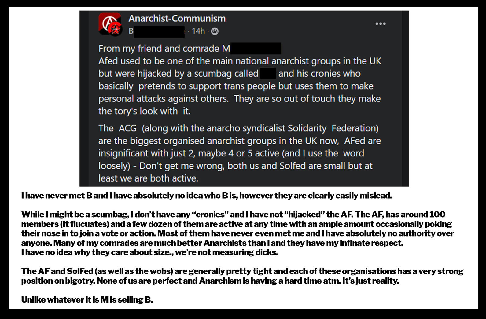 First - This is entirely pointless, "beefing" like this, whether in Ukraine, Brazil, The USA, or UK is absolutely the worst possible use of any Anarchists time. This is not only deeply cringe, but disappointing. Anarchists, we are passionate people and we often discuss important matters and disagree on these important matters in a passionate manner. This is healthy! What isn't is the descent into guttersniping, personal assaults, and worst, campaigns of misinformation and doxxing.Second - I'm responding not to our political difference or even the ad homen, malcious misinterpretions, and selective qouting ACG members use, but because they called me a liar. Smarter comrades than I have, for six years, told me to ignore ACG and other than when they've injected their noxious attitude into projects I'm working on, I've tried to do so, however this is the line. This is not because of some bombastic ego, the masculine need to correct people on the internet, or even something as simple as being offended. This is the line because calling some a liar and putting that into the minds of other militant anarchists, is dangerous to myself and to those I organise with.Third - I have censored pretty much everything here, but I acknowledge that it's still quite easy to lift info from this. As a precaution I have not named certain people or spaces (online and otherwise), or cited specific things, as I am reasonably sure they everyone whose actually in the milleu is aware and if you are not, well, stop being nosey ;p.This website is a gift to the sweaty shut-ins from KF and the like. The sooner I can delete it the better.Fourth - I want to be very clear on three specific things:A: I do not think ACG are transphobic*. I do however feel that their position on trans identity/politics is considered almost tantamount to this by many, especially by many trans people. Their lack of genuine action on this issue as transphobes and fascists have coalesced is neglectful. I truly hope someday they might improve and become a decent Platformist counter-point to the Anarchist Federation. I have said these things many times to even their most ardent detractors.NOTE. I was wrong, there was a leak of their internal forums which illustrated not only that transphobia was tolerated but infact advocated for by principle members of the group.B: I do not support the Ukrainian state or NATO as some would have you believe. I support the anarchist and anti-authoritarian warfighters who have risked their lives to hold the line against a fascistic and imperial invasion. They have no doubt made many difficult decisions and compromises to the supposed "purity" of their anarchism but I do not feel it is my place or anyone elses to judge them, especially as they are very literally dying out there in the cold. Please support the work of Solidarity Collectives, GNIP, and the array of ABC and No Borders groups across the region. They are the best of us.C - You'll see N mentioned here a few times. N thinks we're in some kind of anarchistic face-off, we are not. I actually quite like N. He is, sure, a grumpy bastard, he walks out of bookshops when I see him and say "Ayup", and he downright blanks me at Bookfairs as I ask about how ACG is coming along and try to make with the polite... but he is a smart and knowledgable anarchist, I consider him a comrade and I truly hope we can patch this rift between us someday.Fifth - Inevitably when there is this kind of drama people side with the folk they know, or those that agree with them on some issue or another. I ask you this, regardless of what you think of my political opinions or me personally, consider whether the following behaviour is ok with you.I personally think it's painful watching an anarchist org act like this and try to cause a fellow anarchist personal and political grief in this manner. It's a pointless, useless bunfight and frankly I'm embarassed by the whole thing. You should be too.