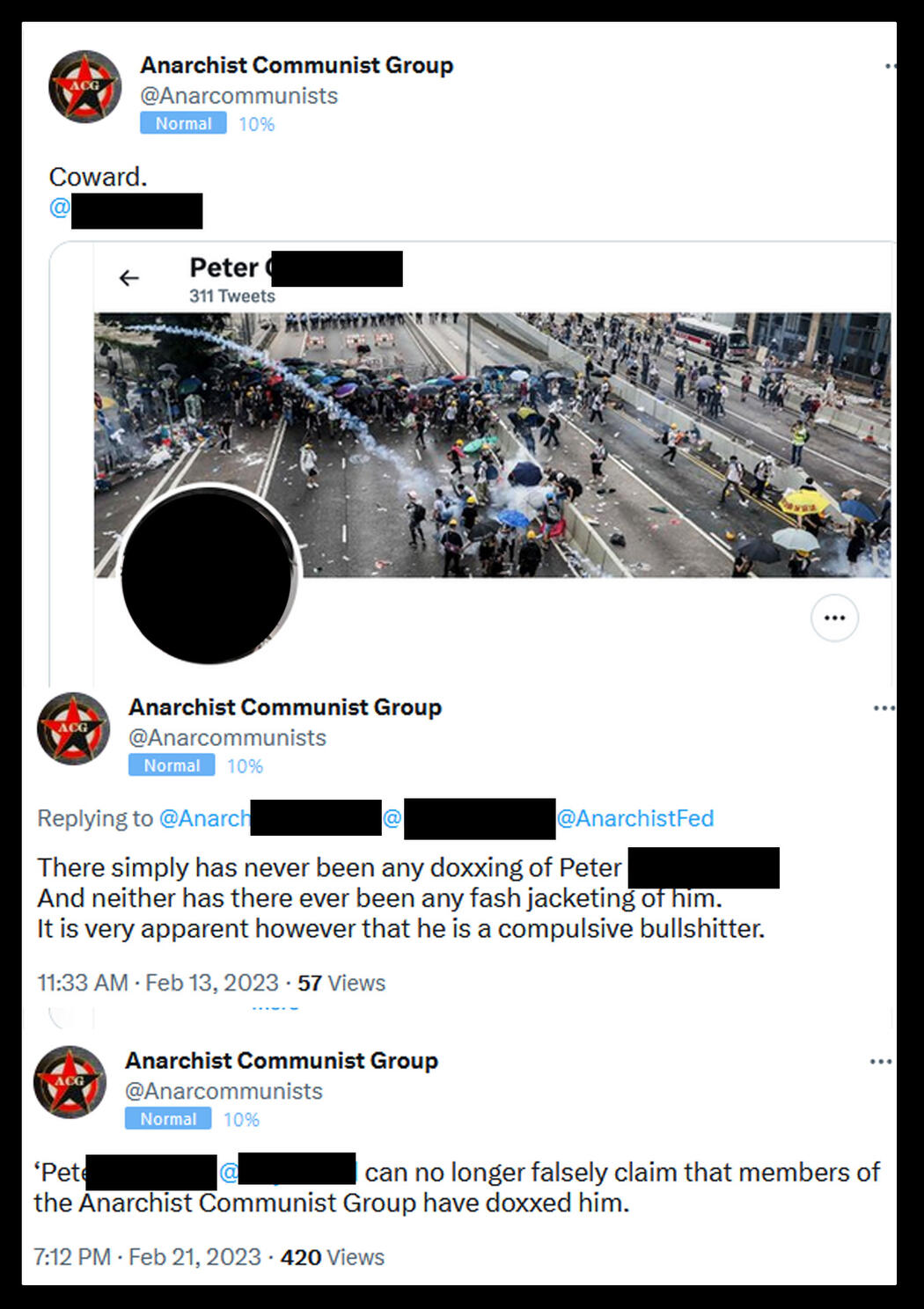 Alex Alder (pen name) posted an article on Libcom attacking (amongst other things) my solidarity with anarchists in Ukraine. This is fine, it's political discourse, I'll write a reply to that in due course.ACG, while posting this article dozens of times in some vain attempt to gain political traction against the AF, tagged me in a twitter post to sneer. They specifically picked me out and tagged my person account. I cussed them out, told them to grow up, maybe apologise for doxxing me that time and then blocked them. I've better things to do.However, they decided to not only say this had never happened but decided to label me a "compulsive bullshitter". I gave them 24hrs (then a week out of fairness) to remove and apologise or I will evidence it. I didn't want to do this because it is cringe and only helps detractors.Ultimately a friend in Brazil told me about similar drama, helped me laugh it off and I went back to ignoring them.They not only took this as a win, but decided to call me a liar again. Ah Well.