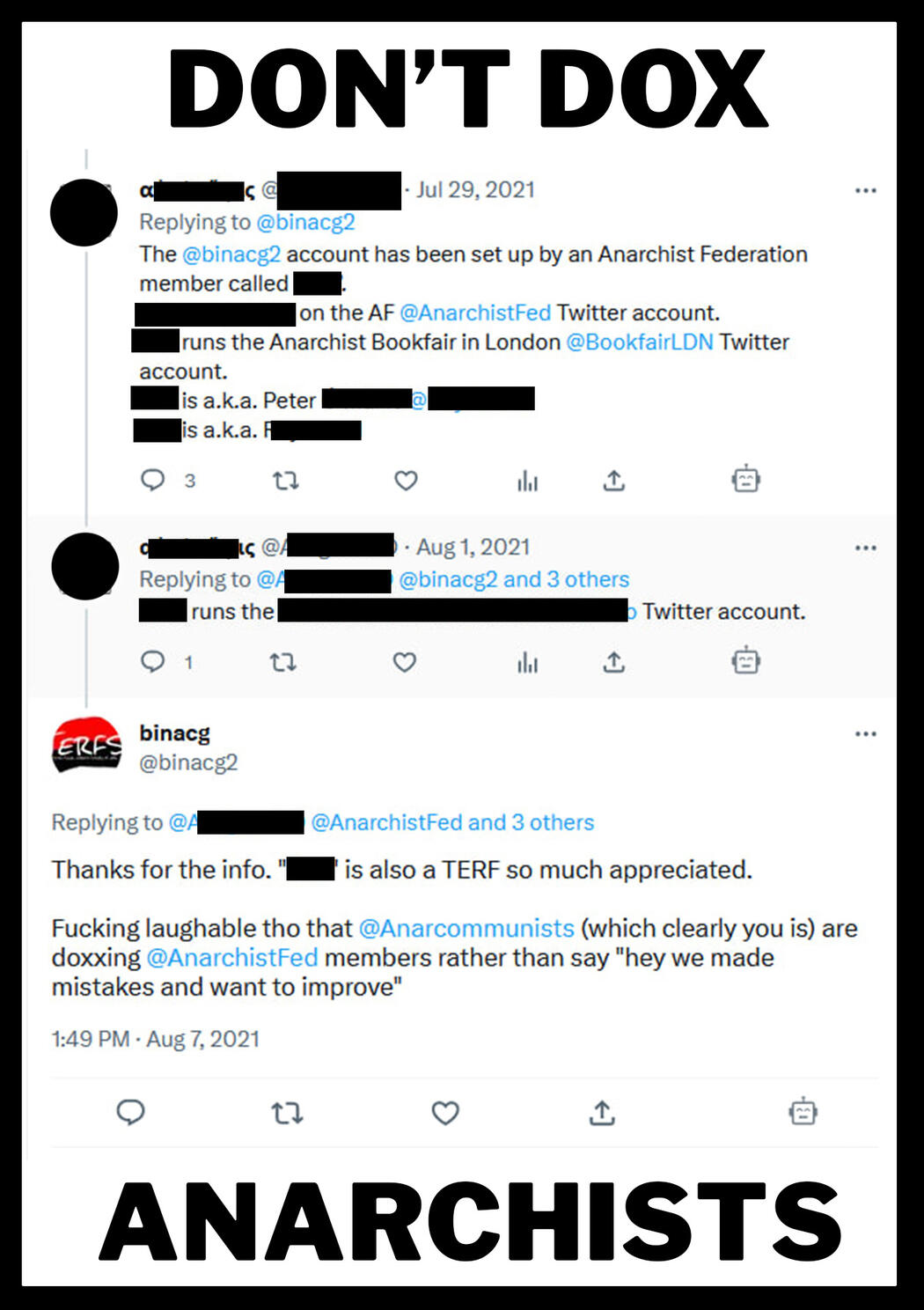Mid 2021, someone made a sockpuppet and had a moan about AnComs in general, focusing on ACG. They took this personal.They also thought it was me (for reasons that elude me). One of their principle characters, N, decided to dox me on twitter, listing my personal account, who I organise with etc.With this info I was able to dox myself entirely finding my home address, photos of me on RedWatch, Online journals and so on.It was a massive security breach and upon accosting N, he acknowledged the mistake (on both accounts) and we agreed to remove the posts. Which we did.N is well known in anarchist circles. He is I'm sure honourable and truthful. Ask him if this happened. Eitherway, other people in our circles can confirm these events.N had however shared this notion with several people who have subsequently jacketed me with this. This undermines peoples trust in me. He never corrected them. Given what we do as militants, this is pretty fucky.
