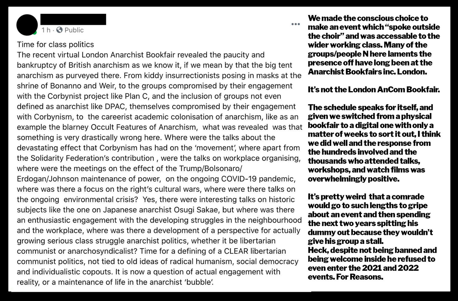 In the immediate wake of the split, N and others took to bad mouthing the AF to everyone would would listen. At the subsequent Liverpool and Manchester Bookfairs there was a constant stream of people asking about our supposed Liberalism and Obsession with "IdPol". Many were happy to name the people who told them these things.The AF decided on a stern policy of no-comment. I personally disagreed with this, but comrades were hoping they could be reached, and pulled away from this recklessness and we could have comradely relations, which is fair enough.During this time the The London Bookfair crew decided they'd had enough and invited others to take it on. So some of us did. We formed a collective of folk from various tendancies and made Bookfair 2020 happen. The worlds largest Digital Anarchist Bookfair. Organised at the last minute as Covid Lockdowns came into place it was by most accounts, a corker. We followed this up with two wildly successful physical Bookfairs.ACG members had said they wouldn't be attending in 2020, it's no longer their crowd. In 2021 and 2022, they asked for a stall at late notice, and were refused. This lead to some online dramatica, a silly back and forth on a forum (Laden with open transphobia, bullying, abuse, and a very stressed me, not replying to things the best because we're trying to not call ACG out in public and sought private discussion).In the first instance N was told directly why, and in the second we formally notified the Federal Secretary.The hilarious thing about this is, during the time ACG members openly stoked hostility towards me, I would argue for a dialogue and that with certain confirmations, they should be given a table. I still believe this.ACG would stall outside both Bookfairs and position themselves as the hard done by renegades who represented "real Anarchism" while the liberals who ran the show excluded them. We told them our position in 2021, They would not apologise for doxxing an organiser, or issue a statement addressing that they had moved beyond the solidarity with a transphobe etc, and some minor issues that should of been easily resolvable. Instead they choose to frame organisers as a "Red Guard" and would continue not to object to open transphobia in anarchist spaces and get increasingly hostile we me for not having a public tiff with them.At one point a self identified Transphobe stated that the bookfair considers saying 'trans women are men' as transphobic, to which the Federal Secretery of ACG said he'd want to know the reasons why she thought "trans women are men" to see whether or not she was transphobic.This level of "trans solidarity" is the kind of thing that concerned the Bookfair collective and we were unwilling to table them without private and positive discussion.After 2022, we made a point to contact them and arranged a meeting with their Federal Secretary who listened to the issues in a comradely spirit, told us that despite their position on "IdPol" they were not transphobic and were now more than the people who split with the AD. He seemed keen to resolve them and we felt positive, with my comrades bursting out to me how delightful it was that we could end the drama and have them at the next event. The next day or so later (after what we assume was a conversation with London ACG and N)* we received a terse message, they would not address any of the concerns and had no interest it doing so.Fine. Well atleast that's that. Everyone can move on, Right?